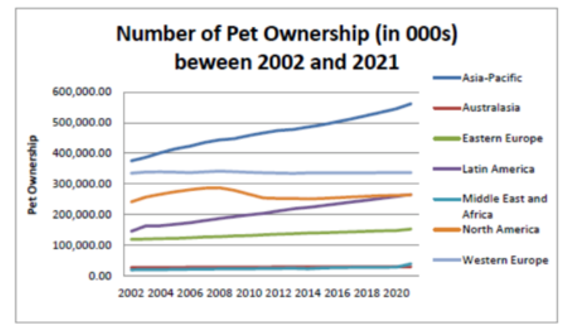 Pet ownership is a growing sector globally, with Asia Pacific showing the strongest growth in pet numbers over the last 18 years. The Middle East and Africa have historically seen low rates of pet ownership, but they have begun to increase in the last couple of years.