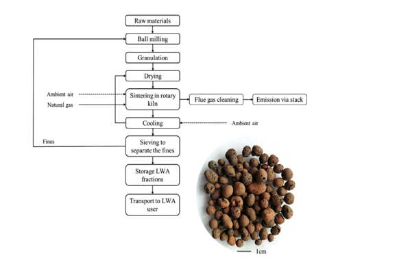 ECA is produced through the expansion of small pellets of clay within a rotary kiln as shown in below figure. Small pellets of clay are formed and dried before entering the rotary kiln. The rotation of the kiln helps to form the pellets into rough spheres.