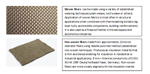 - Existing markets for standard woven basalt fibers not used for application in composites are niche (for example, fire retardant blankets), and there is limited scope for adding value here.