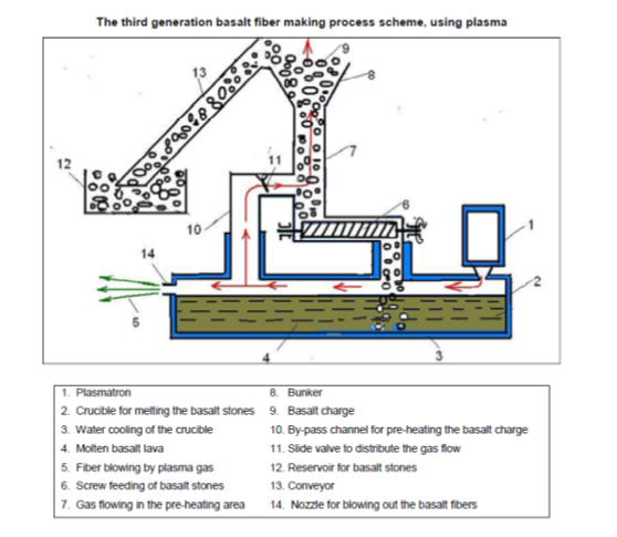 Basalt is produced by blowing a basalt melt with high temperature gas. The current best practice (Figure 7) is to use plasmatrons as a source of the gas[14].