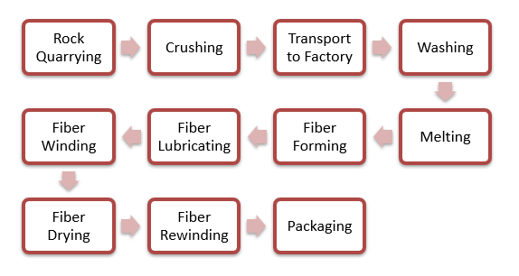 The process of producing fibers from basalt is based on selecting the richest chemical proprieties basalt rocks with the use of quality tests, crushing the rocks and melting to high temperatures. Basalt continues filaments are made from the basalt rocks in a single step process melting and extrusion process. Technological process of manufacturing basalt filament consists of melt preparation, fiber drawing (extrusion), fiber formation, application of lubricants and finally winding. Basalt fibers are currently manufactured by heating the basalt and extruding molten liquid through a die in the shape of fibers.