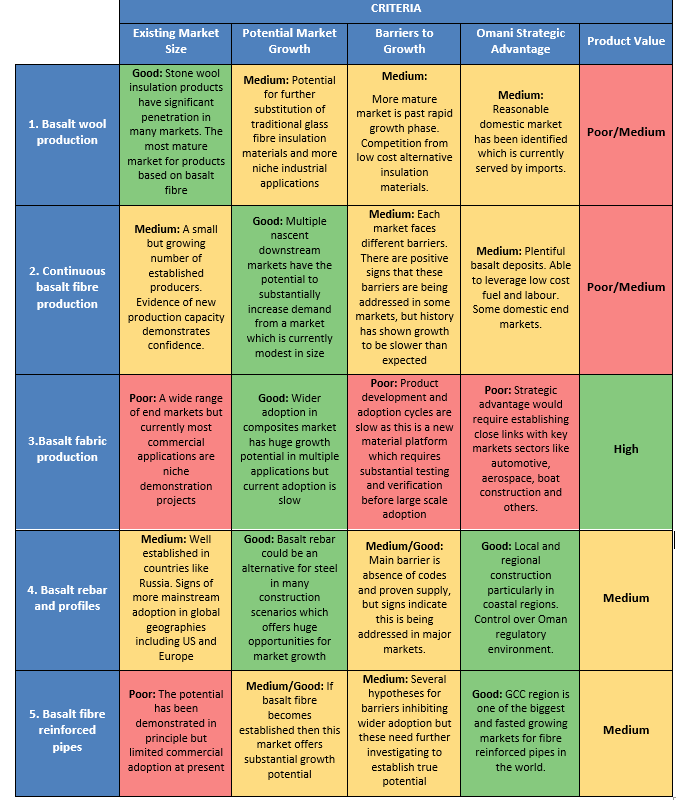 Most opportunities in the basalt fiber industry represent nascent markets with differing risk profiles and growth potential. Table 1 below provides analysis of each opportunity. Analysis may be subject to updates based upon further research. (Note: Basalt Innovation Centre is not included in analysis)