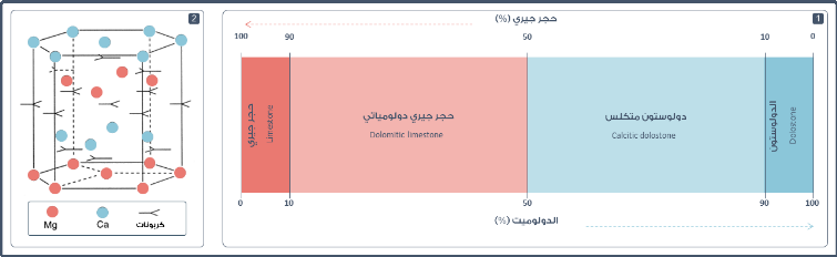 الشكل. 1: يظهر الشكل التباين بين تكوين الحجر الجيري والدولوستون بإختلاف نسب المعادن السائدة في كلًا منهم (1)، كما يظهر الشكل (2) إلى الشكل البلوري لمعدن الدولوميت.