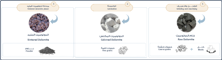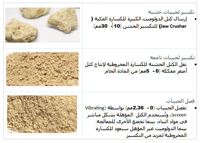 هناك ثلاث مراحل أساسية تخضع لها مواد خام الدولوميت الناتج من مرحلة العمليات الأولية كالتالي: