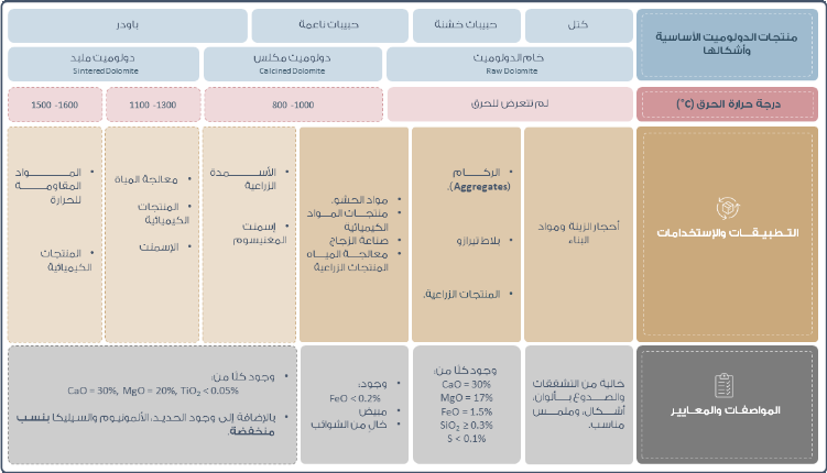 ينتج عن مراحل العمليات الأولية، والثانوية والمعالجة ثلاث منتجات أساسية من خام الدولوميت (الشكل. 5)، حيث تعد جميع هذه المنتجات مصدرًا مهمًا لعنصر المغنيسيوم (Mg) ومركب أكسيد المغنيسيوم (MgO)، إلا أن أشكالها تختلف باختلاف احجام الحبيبات كما هو موضح في الشكل أدناه: