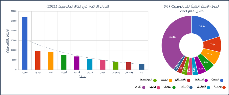 الشكل. 8: يوضح الشكل (في اليمين) الدول الأكثر انتاجًا للدولوميت خلال عام 2021 بالنسبة لإجمالي إنتاج العالم من خام المعدن بإختلاف أشكال المعدن، ويظهر في الشكل المجاور (في اليسار) الكمية المنتجة بالألف طن من قبل كل دولة.