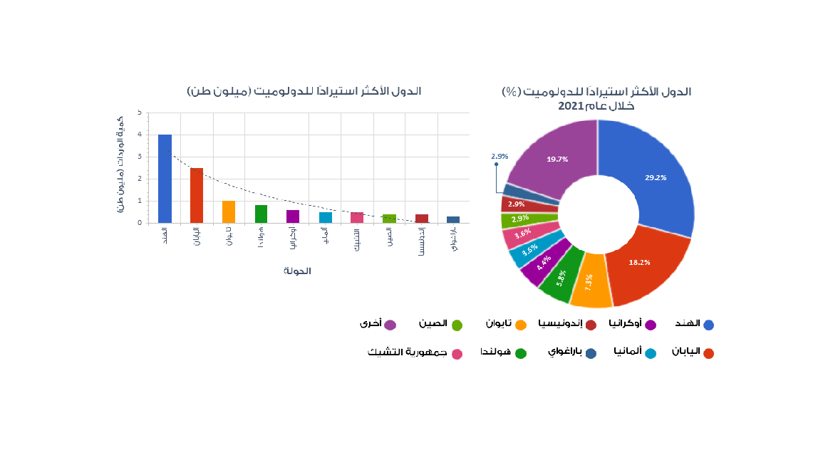 الشكل. 10: يوضح الشكل (في اليمين) الدول الأكثر استيرادًا للدولوميت خلال عام 2021 بالنسبة لإجمالي واردات العالم من خام المعدن بإختلاف أشكاله ، ويظهر في الشكل المجاور (في اليسار) حجم الواردات بالمليون طن لكل دولة.