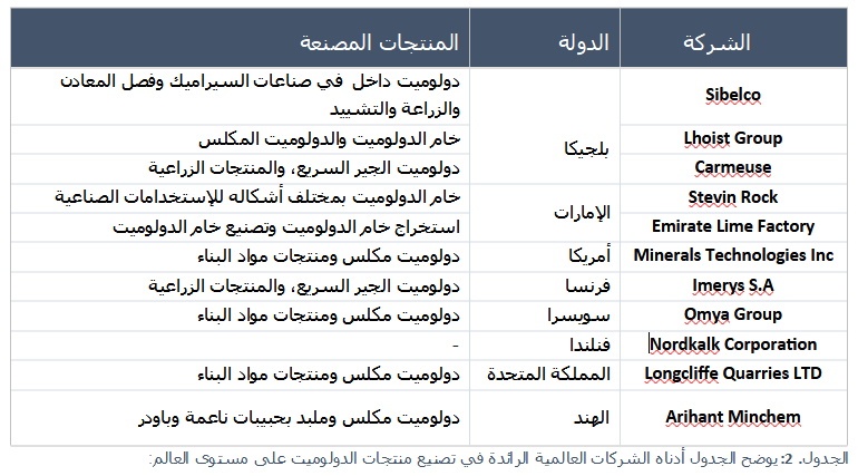وتتوزع الشركات العاملة في قطاع تعدين الدولوميت على مستوى العلم في هذه الدول كما يوضح الجدول (الجدول. 2) أدناه: