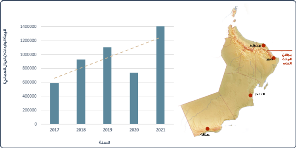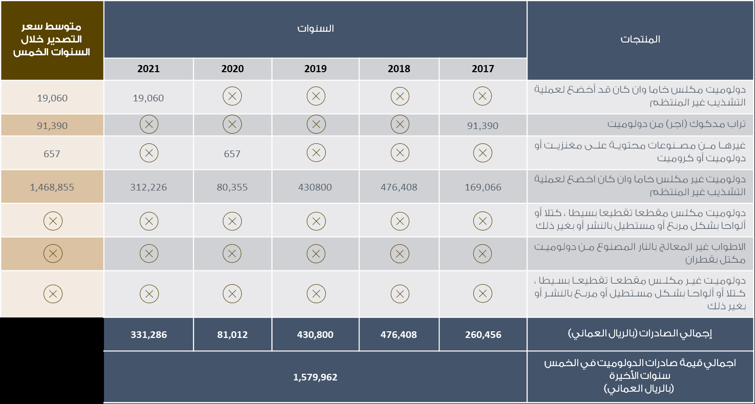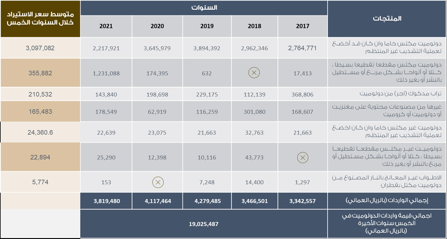 تشير البيانات الصادرة من “المركز الوطني للإحصاء” إلى أن سلطنة عمان تستورد مجموعة من منتجات الدولوميت الأساسية، وهنا أمثلة لبعضًا منها: دولوميت مكلس، وخام الدولوميت، وطوب الدولوميت، وألواح الدولوميت (الشكل. 15). وسيظهر الجدول (الجدول. 3) إجمالي الواردات من هذه المنتجات خلال السنوات الماضية (2017 –2021)، حيث بلغت قيمة إجمالي هذه الواردات 19,025,487 ريال عماني.