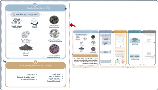 الشكل. 3: يظهر الشكل المراحل الأساسية لعملية تعدين وتصنيع الدولوميت وما تتضمنه كل مرحلة من عمليات ابتداءًا من الاستكشاف والتنقيب، حتى التطبيقات والمنتجات النهائية.