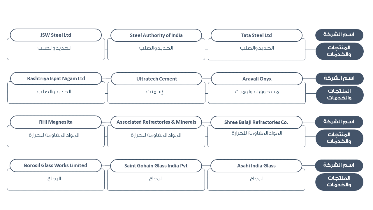 نظرًا لنمو قطاع تعدين خام الدولوميت في الهند تظهر هناك مجموعة من الشركات الرائدة والتي تعمل على مجموعة من الصناعات القائمة لمعدن الدولوميت ويظهر أدناه بعض الأمثلة على ذلك: